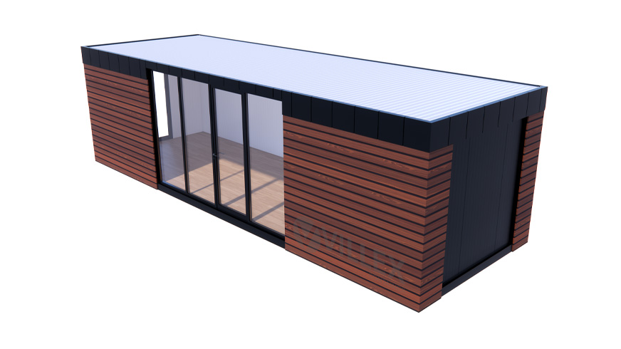 Der Villex Giant Wood Pavillon 3.0 der Villex Container GmbH ist ein großzügiger Bürocontainer, der mit einer Länge von 9,0 m, einer Breite von 3,0 m und einer Höhe von 2,6 m reichlich Raum für vielseitige Nutzungsmöglichkeiten bietet. Die 5 cm starke Dämmung gewährleistet eine zuverlässige Isolierung, während die anthrazitfarbenen Paneele (RAL7016) in Kombination mit dem gleichfarbigen Grundrahmen dem Container ein modernes, elegantes Erscheinungsbild verleihen. Die Ausstattung umfasst eine Glastür und drei zusätzliche Glaselemente, die zusammen mit einem bodentiefen Fenster (1000 x 2000 mm) für eine lichtdurchflutete, offene Atmosphäre sorgen. Zur Elektrikausstattung gehören ein 32A CEE-Stecker, drei Doppelsteckdosen, zwei LED-Leuchten sowie ein Lichtschalter, wodurch eine praxisgerechte Nutzung sichergestellt ist. Mit einem Gewicht von 2000 kg ist der Villex Giant Wood Pavillon 3.0 besonders robust und stabil, gleichzeitig aber flexibel einsetzbar. Er kombiniert Funktionalität mit hochwertigem Design und eignet sich ideal als stilvoller Bürocontainer für anspruchsvolle Einsatzbereiche.