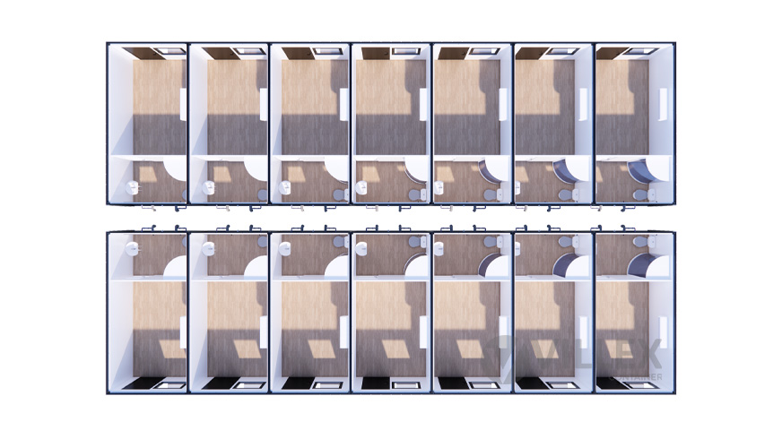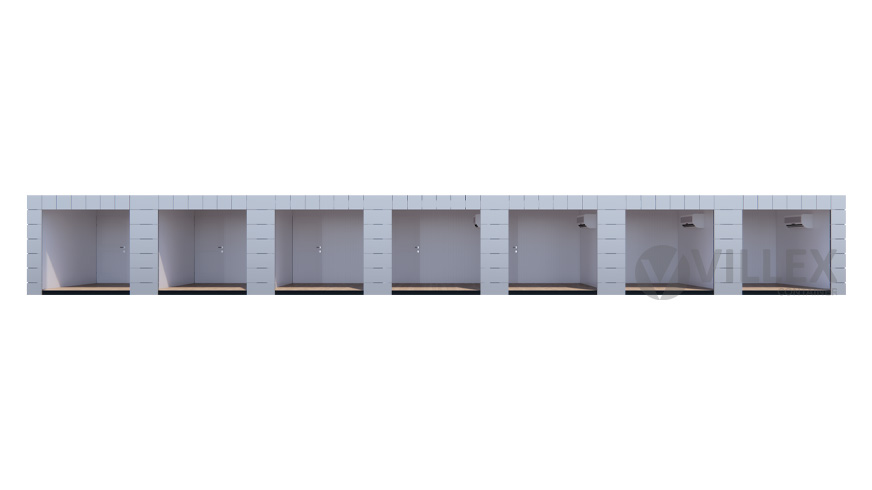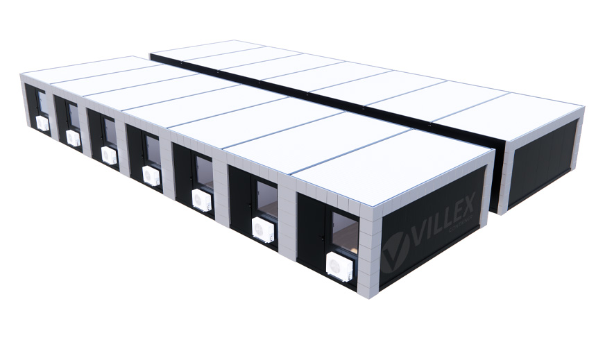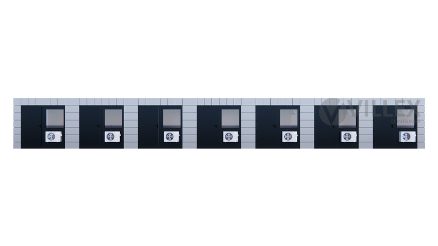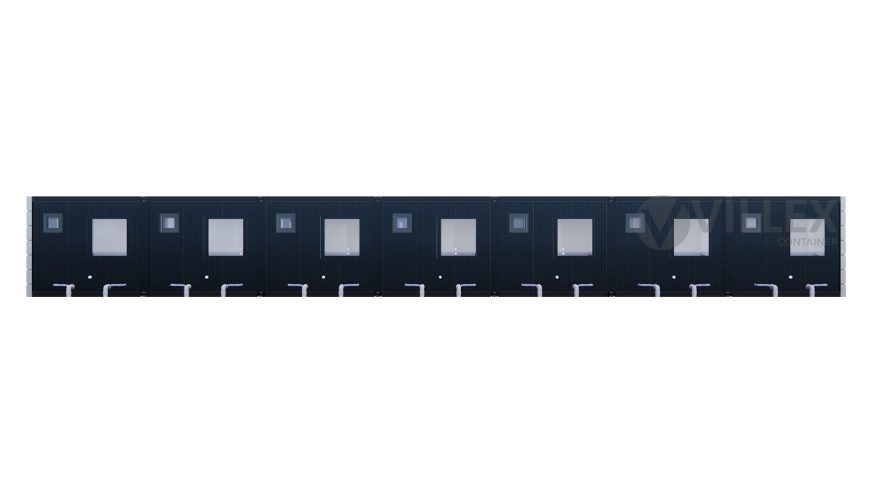 Die Villex Mehrfachanlage ist ein hochwertiger Bürocontainer-Anlage mit einer Länge von 20,9 Metern, einer Breite von 13,06 Metern und einer Höhe von 2,6 Metern. Die Dämmung von 5,0 cm Stärke sorgt für optimale Isolation und ein angenehmes Raumklima. Die Fassade sowie der Grundrahmen sind in der Farbe RAL7016 (Anthrazit) gehalten, was dem Container ein modernes und elegantes Erscheinungsbild verleiht. Mit einem Gewicht von 14000 Kilogramm ist er robust und langlebig. Der Container ist mit einer gedämmten Stahltür ausgestattet, die mit Stahlwolle isoliert ist, sowie mit 2 Fenstern in den Maßen 1000 x 1000 mm. Diese Fenster sorgen für viel Tageslicht und eine angenehme Atmosphäre im Inneren. In Bezug auf die elektrische Ausstattung verfügt der Container über einen 32A CEE-Stecker in Rot, drei Doppelsteckdosen, zwei LED-Leuchten und einen Lichtschalter, was ihn ideal für den Einsatz als Büro oder vielseitigen Arbeitsbereich macht.