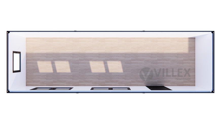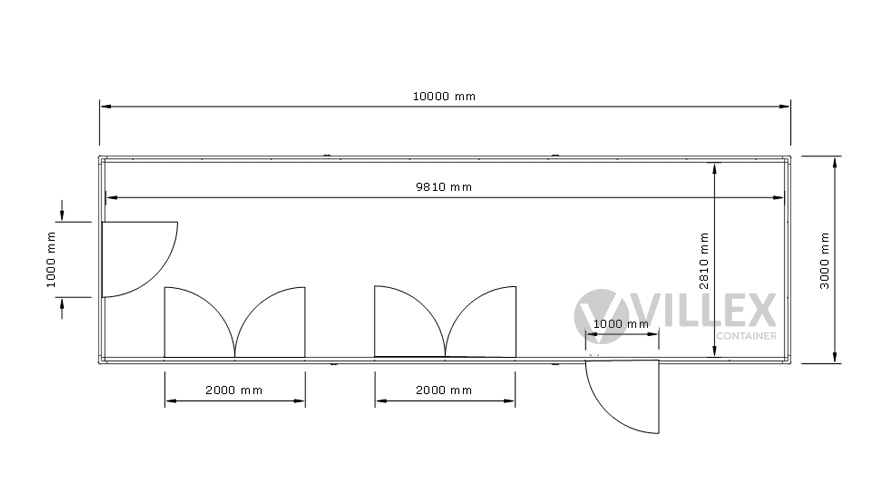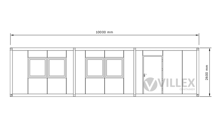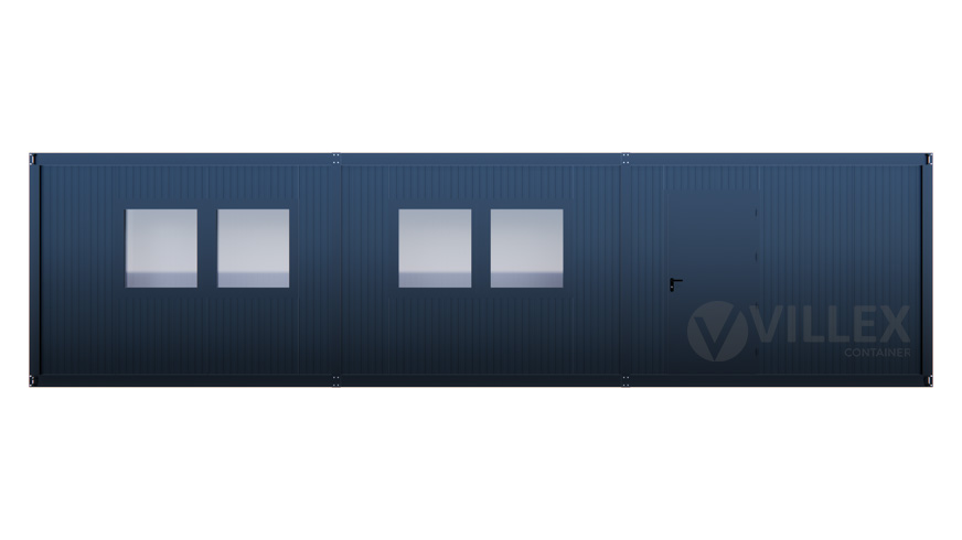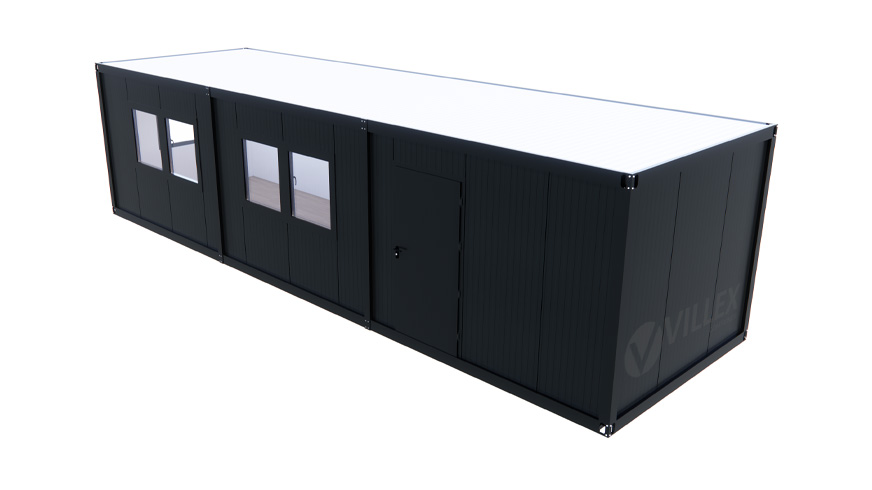 Der Villex Ultra Giant Cube Doppio Fenster Nero 1.0 ist ein hochwertiger Bürocontainer mit einer Länge von 10,0 Metern, einer Breite von 3,0 Metern und einer Höhe von 2,6 Metern. Die Dämmung von 5,0 cm Stärke sorgt für optimale Isolation und ein angenehmes Raumklima. Die Fassade sowie der Grundrahmen sind in der Farbe RAL7016 (Anthrazit) gehalten, was dem Bürocontainer ein modernes und elegantes Erscheinungsbild verleiht. Mit einem Gewicht von 1900 Kilogramm ist er robust und langlebig. Der Container ist mit einer gedämmten Stahltür ausgestattet, die mit Stahlwolle isoliert ist, sowie mit zwei großzügigen Doppelfenstern in den Maßen 2000 x 1000 mm und einem zusätzlichen Standard-Fenster mit den Maßen 1000 x 1000 mm. Diese Fenster sorgen für viel Tageslicht und eine angenehme Atmosphäre im Inneren. In Bezug auf die elektrische Ausstattung verfügt der Container über einen 32A CEE-Stecker in Rot, drei Doppelsteckdosen, zwei LED-Leuchten und einen Lichtschalter, was ihn ideal für den Einsatz als Büro oder vielseitigen Arbeitsbereich macht.