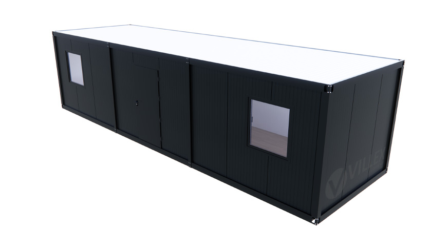 Der Villex Ultra Giant Cube Nero 1.0 der Villex Container GmbH ist ein vielseitig einsetzbarer 10,0 Meter Container mit robuster Bauweise und hochwertiger Ausstattung. Mit einer Länge von 10,0 m, einer Breite von 3,0 m und einer Höhe von 2,6 m bietet er großzügigen Raum für verschiedenste Anwendungen. Die 5 cm starke Dämmung sorgt für eine optimale Isolierung und ein angenehmes Raumklima. Die anthrazitfarbenen Paneele (RAL7016) und der gleichfarbige Grundrahmen verleihen dem Container ein modernes und stilvolles Design. Er ist mit einer gedämmten Stahltür sowie zwei doppelt verglasten Standard-Fenstern (1000 x 1000 mm) ausgestattet, die für ausreichend Tageslicht sorgen. Zur Elektrik Ausstattung gehören ein 32A CEE-Stecker (Rot), drei Doppelsteckdosen, zwei LED-Leuchten und ein Lichtschalter. Mit einem Gewicht von 2.200 kg ist der Villex Giant Cube Nero 1.0 eine stabile und dennoch mobile Lösung für Büro-, Aufenthalts- oder Lagerräume.