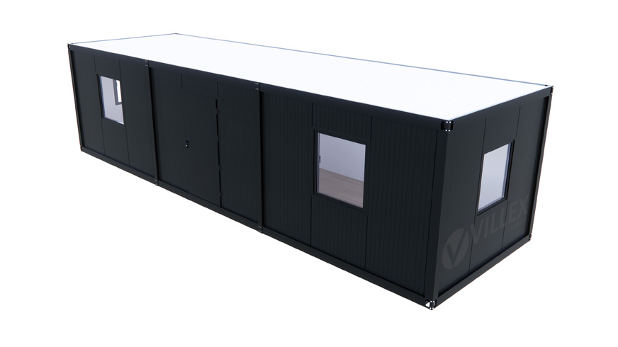 Der Villex Ultra Giant Plus Cube Nero 5.0 der Villex Container GmbH ist ein moderner 9,0 Meter Bürocontainer, der durch seine robuste Bauweise und vielseitige Einsatzmöglichkeiten überzeugt. Mit einer Länge von 10,0 m, einer Breite von 3,0 m und einer Höhe von 2,6 m bietet er ausreichend Platz für unterschiedliche Anwendungen. Die 5 cm starke Dämmung sorgt für eine effiziente Isolierung und angenehme Raumtemperaturen. Die anthrazitfarbenen Paneele (RAL7016) und der passende Grundrahmen (RAL7016) verleihen dem Container ein elegantes und professionelles Erscheinungsbild. Der Container ist mit einer gedämmten Stahltür (Steinwolle Isolierung) sowie vier Standard-Fenstern (1000 x 1000 mm, doppelt verglast) ausgestattet, die für eine helle Arbeitsumgebung sorgen. Zur Elektrik Ausstattung gehören ein 32A CEE-Stecker (rot), drei Doppelsteckdosen, zwei LED-Leuchten und ein Lichtschalter, wodurch eine zuverlässige Stromversorgung sichergestellt wird. Mit einem Gewicht von 2200 kg bleibt der Container stabil und flexibel einsetzbar.