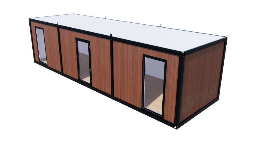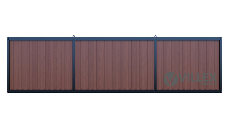 Der Villex Ultra Giant Wood Pavillon 2.0 vereint funktionalen Raum mit ansprechender Holzoptik – ideal für alle, die Wert auf eine moderne und zugleich einladende Gestaltung legen. Mit 10,00 m Länge, 3,00 m Breite und 2,60 m Höhe bietet er rund 30,0 m² Nutzfläche, perfekt geeignet als Büro-, Empfangs- oder Besprechungsraum. Besonders hervorzuheben sind die Paneele in ansprechender Wood-Optik, kombiniert mit einem anthrazitfarbenen Grundrahmen (RAL 7016). Diese Material- und Farbwahl verleiht dem Container eine hochwertige, warme Ausstrahlung, die sich sowohl in urbanem als auch natürlichem Umfeld harmonisch einfügt. Die zwei bodentiefen Fenster (je 1000 x 2000 mm) sorgen für großzügigen Tageslichteinfall und schaffen ein offenes, helles Raumgefühl. Eine moderne verglaste Eingangstür rundet das Erscheinungsbild ab und ermöglicht einen einladenden Zugang. Mit einer 5,0 cm starken Dämmung eignet sich der Container für saisonale Einsätze oder kurz- bis mittelfristige Nutzungen. Die vollständige elektrische Ausstattung umfasst einen 32 A CEE-Starkstromanschluss, drei Doppelsteckdosen, zwei LED-Leuchten und einen Lichtschalter – für einen sofortigen und reibungslosen Betrieb. Mit einem Gewicht von nur 2.200 kg ist der Pavillon besonders leicht und dadurch einfach zu transportieren und flexibel einsetzbar – ideal für Veranstaltungen, Märkte, Baustellen oder als temporäre Büroeinheit auf Firmengeländen.
